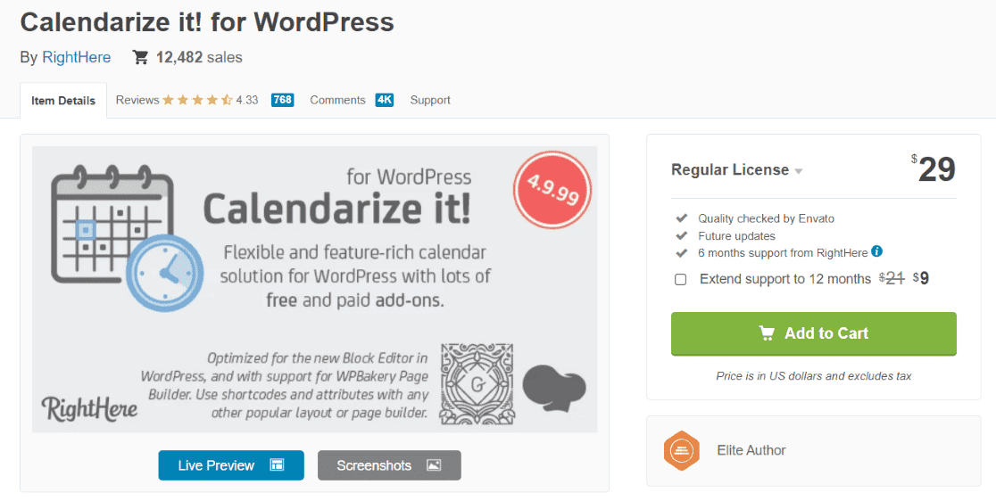 Calendarize it! is another calendar plugin for WordPress and the last one on our list. It has quite a few features for a basic calendar, and has many available addons (both free and premium) to make it more full-featured. It has many standard views including month, week, day, agenda week/day, and more. It also comes with multiple different widgets to show upcoming events.