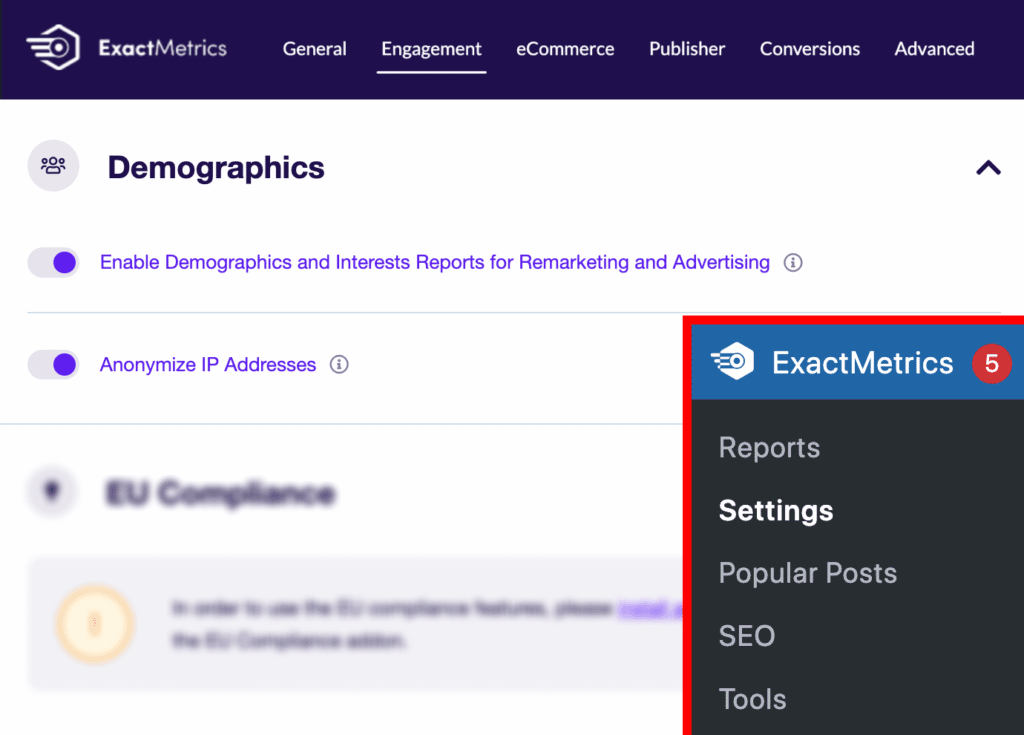 If this option is missing, it means you have the EU Compliance addon installed and activated. When this addon is active, the option is automatically enabled and instead located within the EU Compliance section at ExactMetrics » Settings » Engagement » EU Compliance: