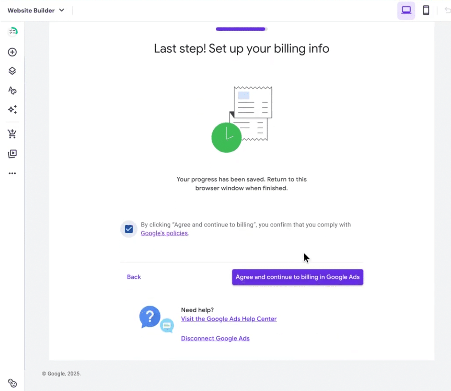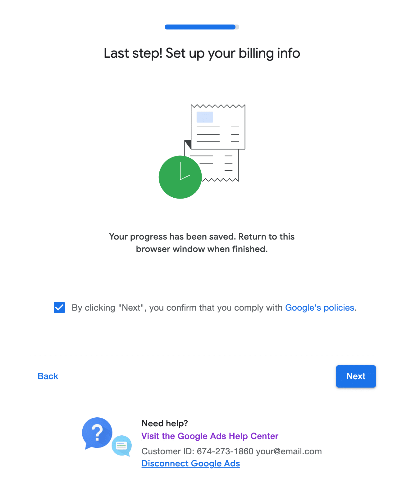 Now it’s time to review the terms and conditions and configure your billing setup for your account. If you accept the terms, select the checkbox, then you’ll be taken to Google Ads to provide your payment details and finalize your billing configuration. Click next when ready to proceed