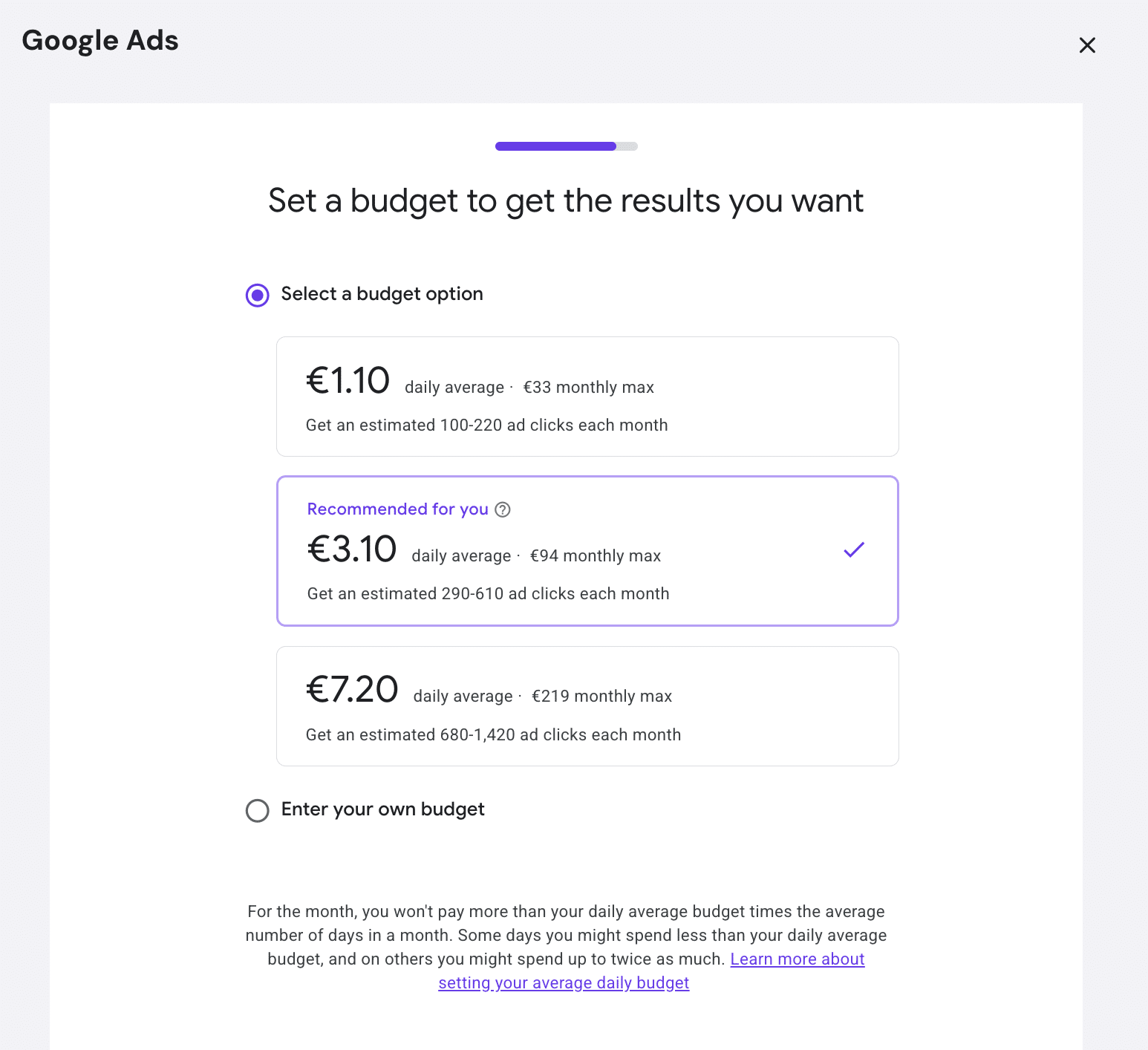 Determine the budget for your campaign. Choose from suggested budgets or enter your own by choosing the “Enter your own budget” option. Once set, click Next.