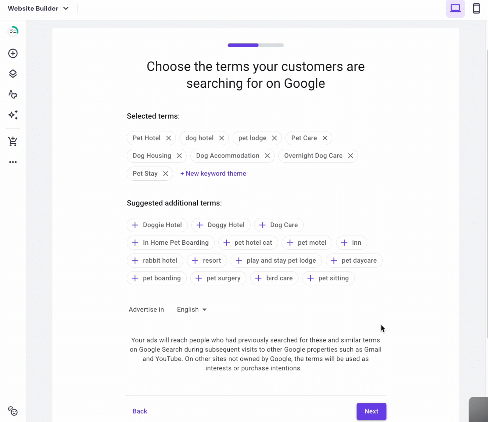 In this step, we are adding your search themes relating to your business or the advertised product. Google Ads may provide suggestions, but you can add custom keywords too.