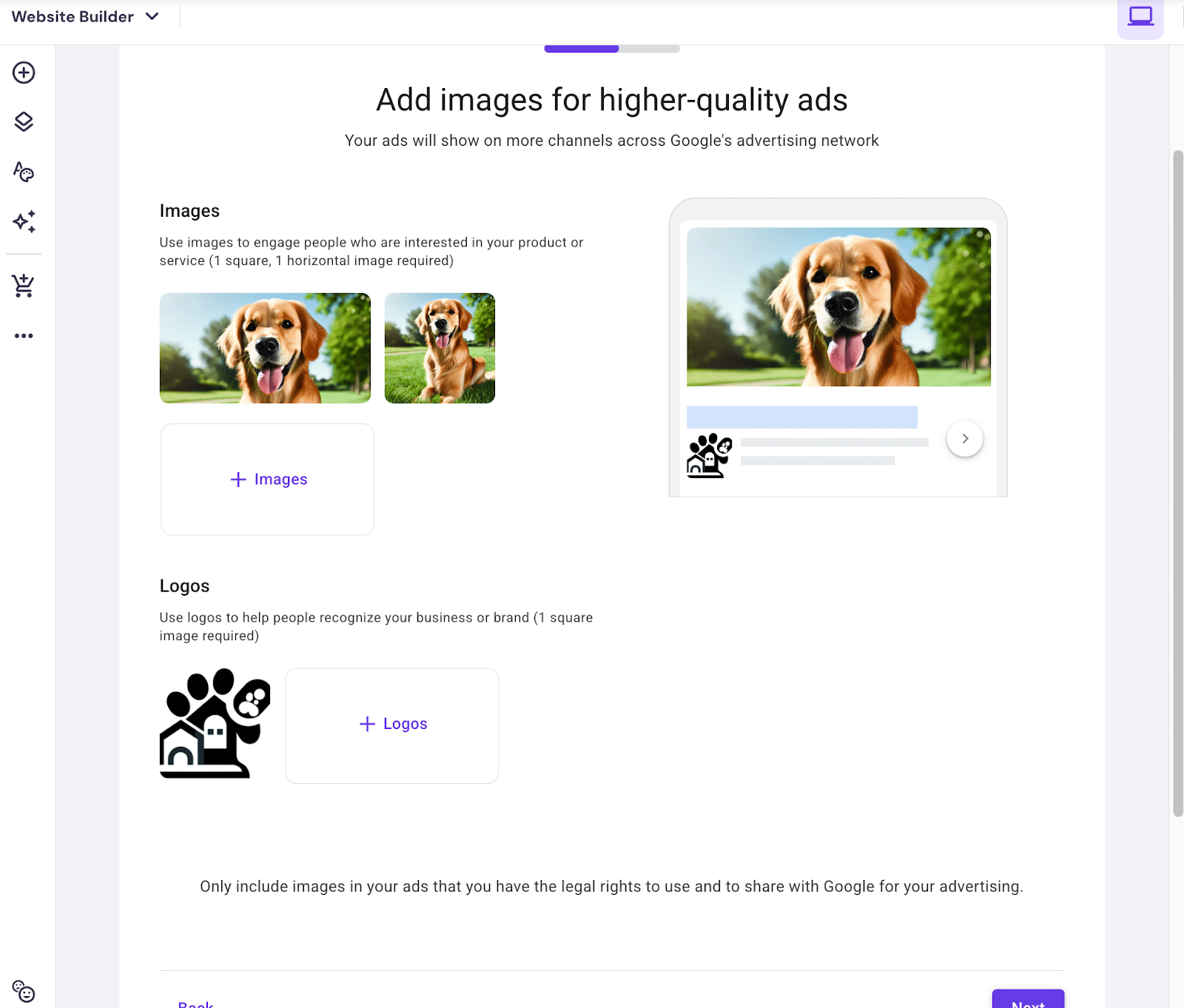 Upload your logo and other images for use in your ad. You’ll need at least one square (1:1) and one horizontal (4:5) image, plus a logo. Click Next after uploading images.