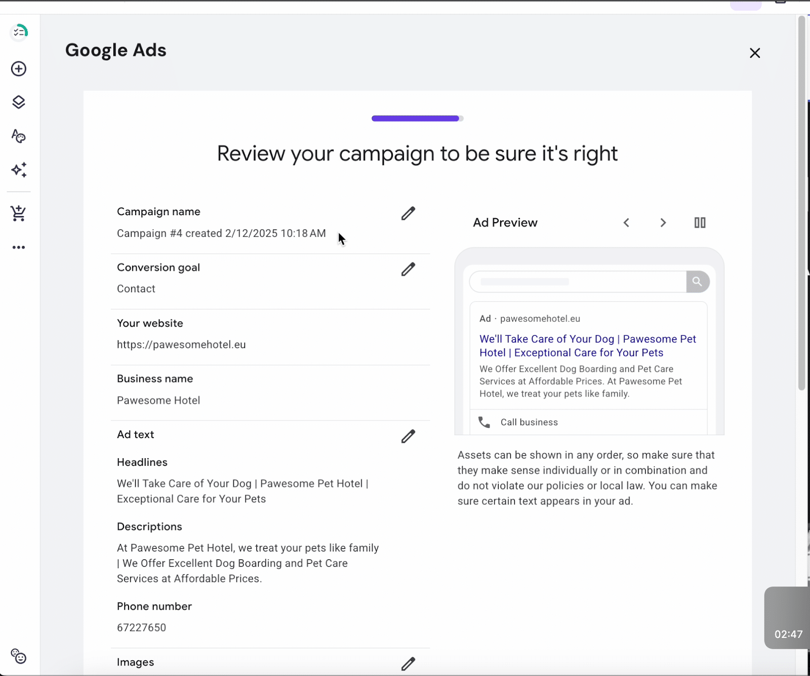 Here comes the fun part! Create your ad content. You can preview it and make changes if needed. Include multiple headlines, descriptions, and even a call button for direct contact. Once done, click Next.