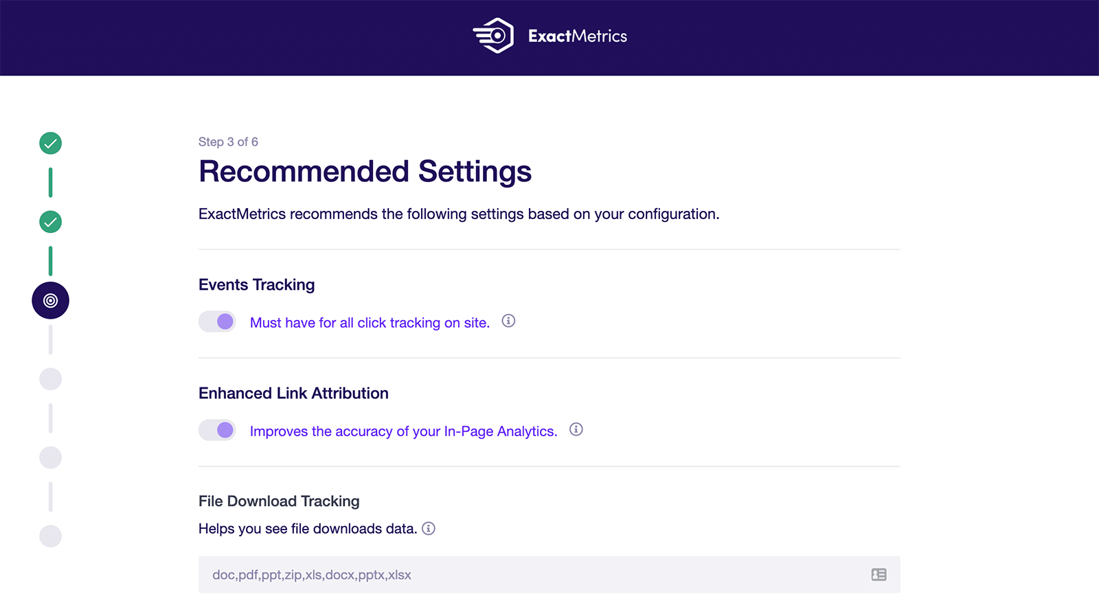 ExactMetrics will then offer some recommended settings based on the website type you selected earlier.