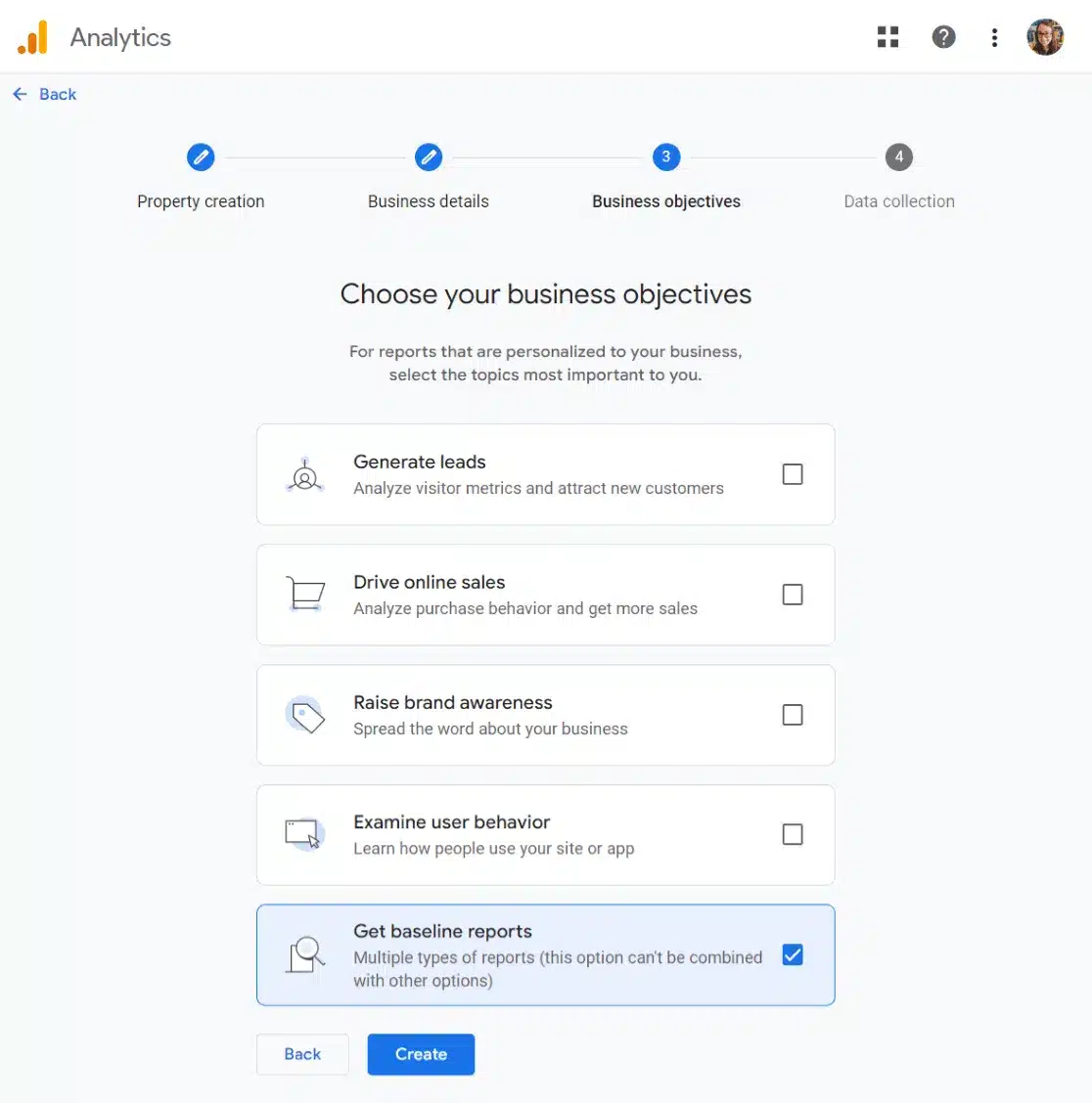 Lastly, you’ll choose your business objectives. In order to get all of the Google Analytics reports populated in your account, I recommend choosing Get baseline reports.